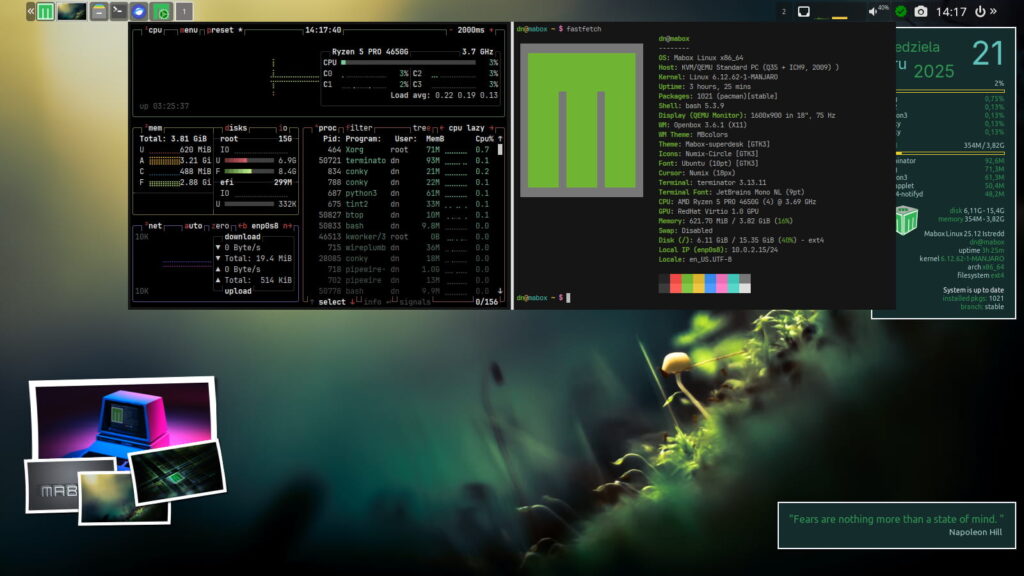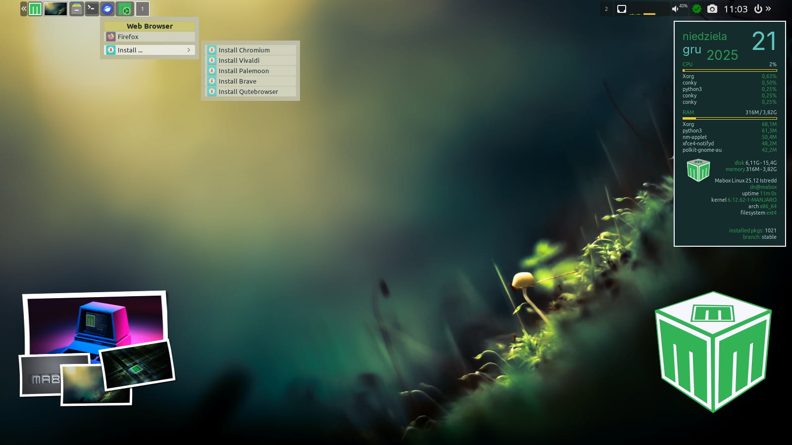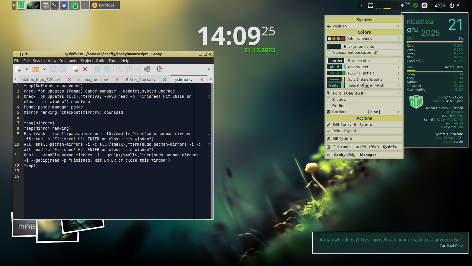 In Mabox, Conky offers unique features: a context menu (right-click) to control each Conky, and the ability to define a launcher (left-click action).