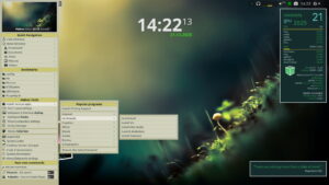 The main menu can be accessed by right-clicking on the desktop, clicking the icon on the panel (logo) or using the super key (windows key).